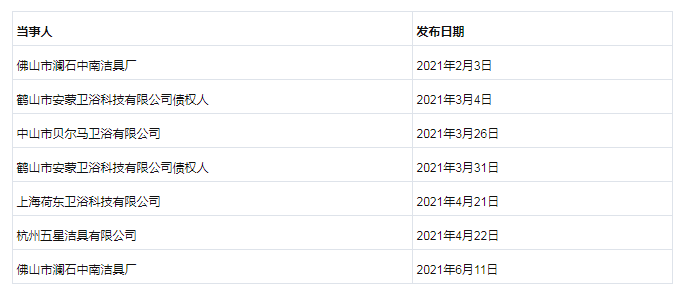 人民法院公告网公开信息显示,2021年1-6月,全国新增7份涉及卫浴企业的破产文书。涉及5个当事人,包括鹤山市安蒙卫浴科技有限公司、佛山市澜石中南洁具厂、中山市贝尔马卫浴有限公司、上海荷东卫浴科技有限公司及杭州五星洁具有限公司。