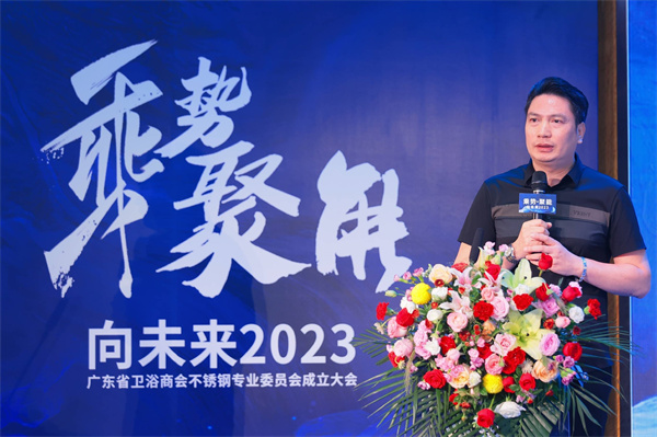 作为广东省卫浴商会不锈钢专业委员会的成立见证者,广东省卫浴商会秘书长张书儒在致辞中对不锈钢产业发展历程和趋势进行介绍,简析不锈钢专业委员会成立初衷、意义及未来工作内容。他表示,正如大会主题所示,“乘势·聚能·向未来”!历经一年多的筹备,不锈钢专业委员会正式成立并集聚一众不锈钢卫浴品类最为优秀的企业,大家共同推动不锈钢卫浴产业发展,群策群力,创造更为耀眼的未来。
