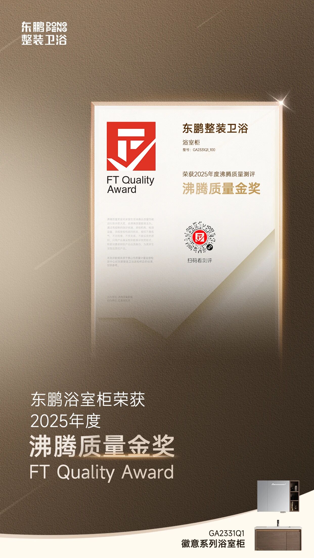 徽意浴室柜(沸腾质量金奖): 经佛山市质量计量监督检测中心检测,该款木制浴室柜在基础指标、环保性能、耐用性能、防潮性能、耐污性能等22项指标上全部达标,且多项性能优于标准,充分满足了现代家庭对浴室家具健康、耐用、易清洁的高品质需求。