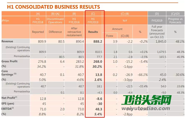卫浴头条网讯 5月13日,骊住公布了2018财年财务报告。2018年4月至2019年3月,骊住取得销售额18326亿日元(约人民币1145.90亿元),同比增加0.2%;营业利润128亿日元(约人民币8亿元),减少83%;归属于母公司股东的净利润为亏损522亿日元(约人民币32.64亿元)。骊住集团的主要海外子公司有高仪、美标、帕玛斯迪利沙3家。2018财年,高仪实现销售额15.13亿欧元(约人民币116.54亿元),与上年持平营业利润1.50亿欧元(约人民币11.55亿元),减少17%;营业利润率10%。美标方面,2018财年创下12.47亿美元(约人民币85.53亿元)的销售额,同比增加5%;营业利润0.55亿美元(约人民币3.77亿元),减少30%;利润率4%。帕玛斯迪利去年销售额为11.17亿欧元(约人民币86.04亿元),同比减少13%,营业利润亏损3.23亿欧元(约人民币24.88亿元),相对上年0.09亿欧元的盈利大幅下滑。