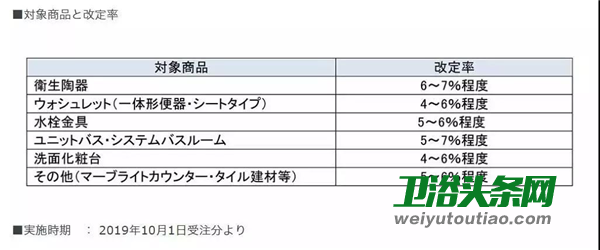据悉,TOTO公布其2018年4月至2019年3月取得的销售额为5860亿日元,同比减少1%,中国市场的销售额下降了12%,而且除了销售额的下降,成本的上涨更让TOTO归属股东的利润下降了12%。4月26日,TOTO在官网公告,将自2019年10月1日起上调旗下产品的建议零售价,其中:卫生陶瓷涨价6-7%;智能马桶涨价4-6%;五金洁具涨价5-6%;整装卫浴涨价5-7%;洗手台涨价4-6%;瓷砖等其他品类涨价5-6%。