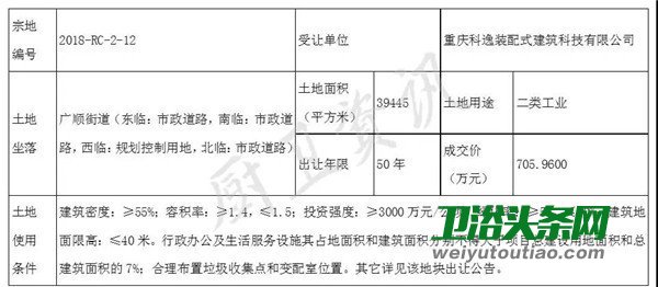 除此以外,厨卫资讯还发现重庆科逸装配式建筑科技有限公司竞得2018-RC-2-12号土地,土地面积为39445平方米(59.1675亩),土地用途为二类工业,成交价为705.96万元,出让年限为50年。