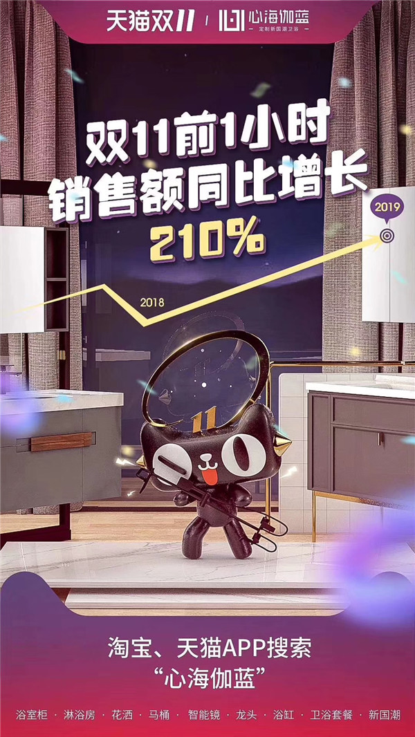 心海伽蓝全卫定制的天猫店铺在前1小时销售额同比增长210%,并且全国800家线下门店也同步了双十一活动。