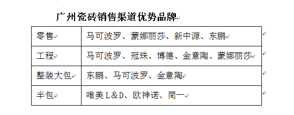 金意陶广州公司总经理肖宁表示,今年的市场形势比去年预期得稍好,广州门店今年的零售额度同比去年增长了20%左右,但自然客流仍然较少。他表示,金意陶在广州主要走工程(与地产公司合作)、整装、家装(半包为主)、超市(主要指百安居)和网络平台,并针对不同渠道将产品做了细分。他特意将整装和普通家装渠道分开来介绍:在整装渠道主要与靓家居、生活家等整装公司合作,而在普通家装渠道则较为分散,因为没有哪家家装公司在广州能处于绝对领导地位。此外,由于广州设计师渠道十分流行,金意陶也与不少个人工作室展开合作。