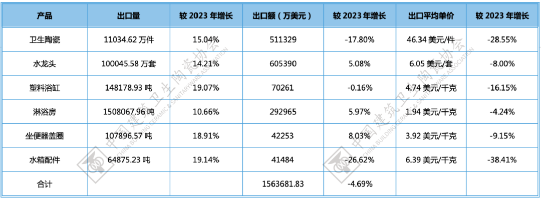 2024年,我国卫生洁具出口总额为156.37亿美元,同比下降4.69%,整体呈现“量增价跌”趋势。相较2023年,各类产品出口量都实现了两位数增长,但出口单价普遍下跌,市场竞争加剧,利润空间压缩。