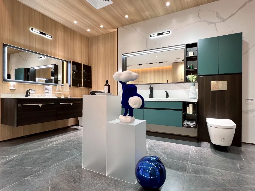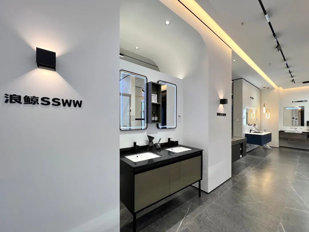 门店以原木色、白色墙面创设家的感觉,沉浸在温馨场景中,移步到个性化风格突显的浪鲸卫浴样板间,更使人着迷。
