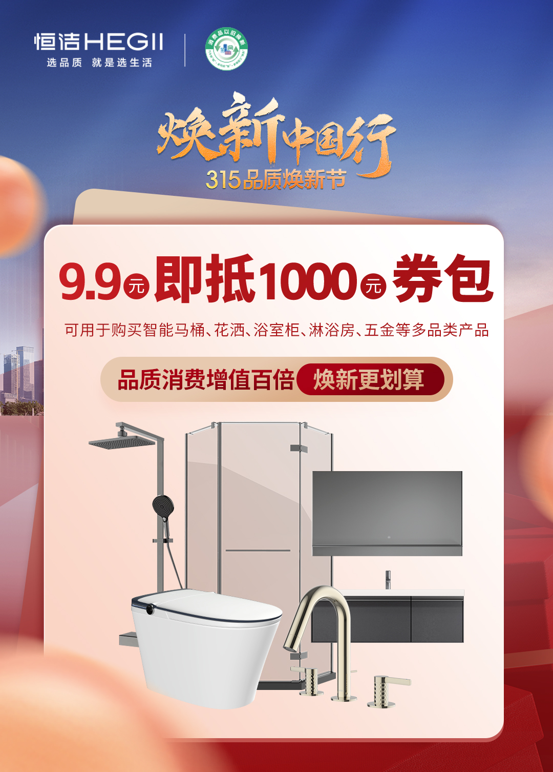 小投入,大惊喜!9.9元即抵1000元券包,用于智能马桶、花酒、浴室柜、淋浴房、五金等多品类产品购买,真正实现消费增值,焕新更划算。