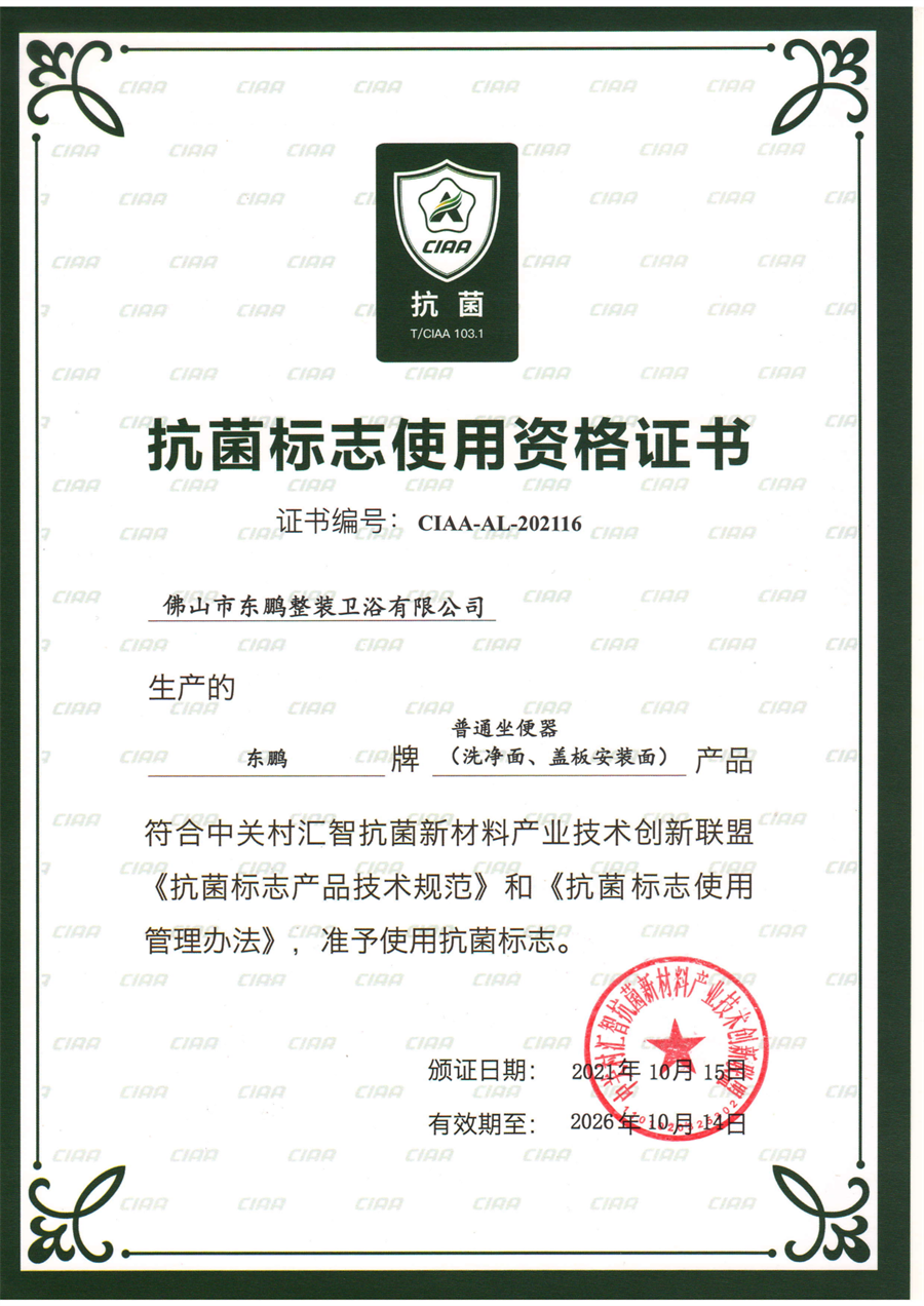 此外,本次大会现场发布了2025年度抗菌标志产品,对获得抗菌标志使用授权的品牌进行公布。多年来,东鹏整装卫浴持续获得行业权威认证。从2021年起,东鹏的多款产品连续获得CIAA抗菌标志产品称号。现在,东鹏整装卫浴多品类产品获得CIAA抗菌标志认证,这意味着卫浴空间每一个细节,从普通坐便器到智能马桶,从龙头五金到陶瓷盆,再到卫浴核心淋浴房,东鹏整装卫浴的多样产品线均达到国家严苛的抗菌标准。