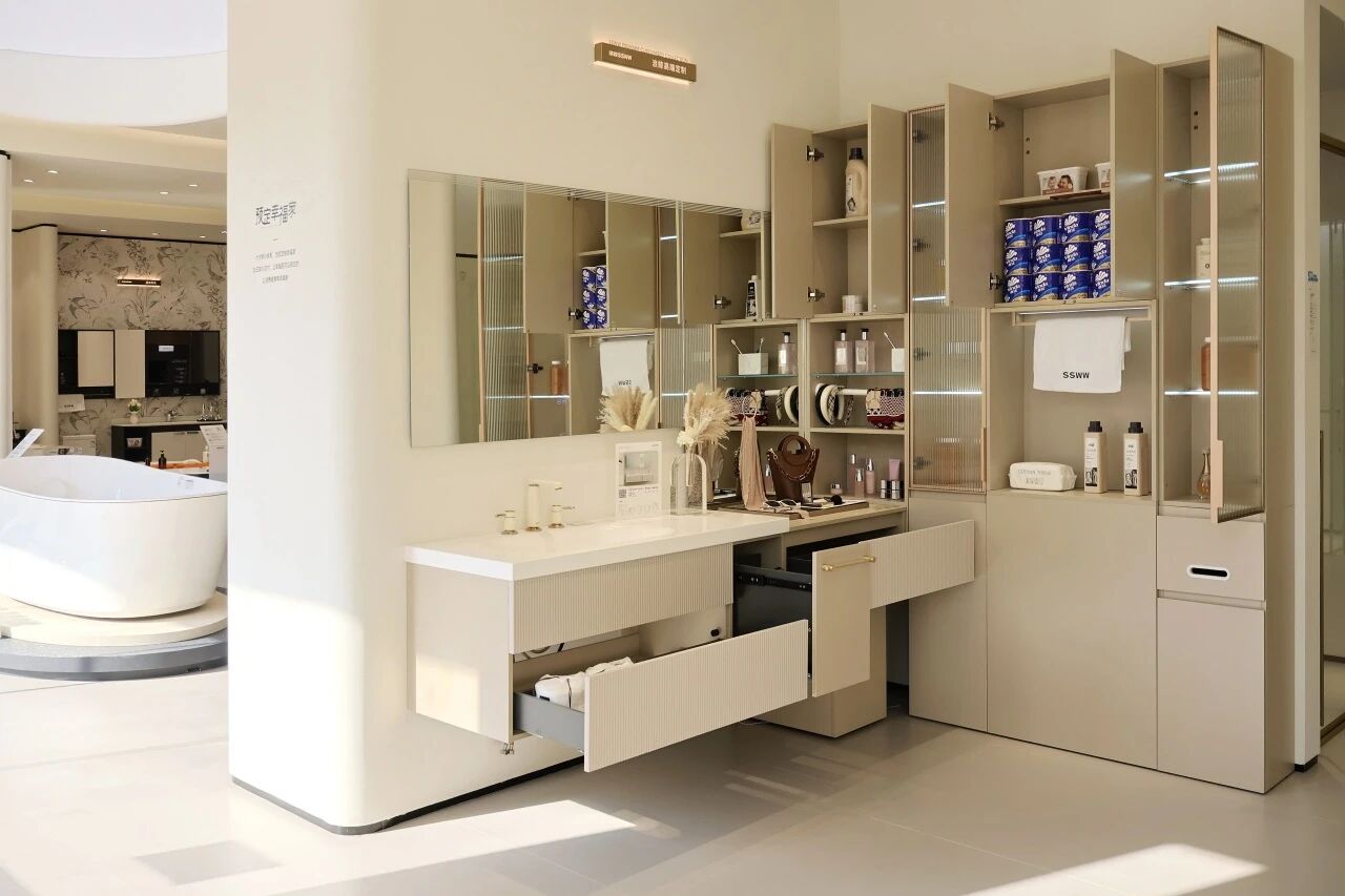 踏入门店,首先映入眼帘的是定制浴室柜区,其颜值拉满的设计不仅让消费者的目光为之停留,更让消费者亲身体验到个性化定制的魅力。紧跟其后的是智能马桶区,该区域以一墙到顶的岩板作为背景墙,与智能马桶相辅相成。在区域中心位置,巧妙地设置了一个圆形吧台,其轻奢格调与整体环境相得益彰,成为店内的一大亮点。