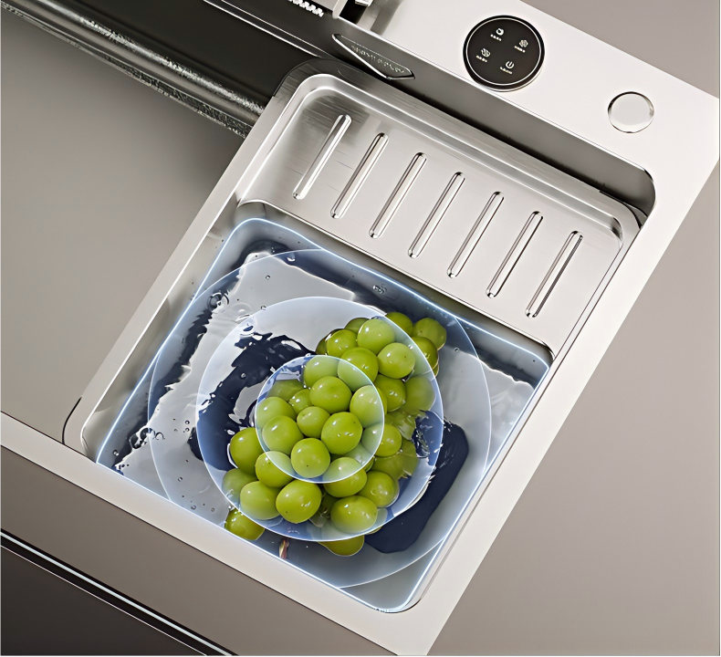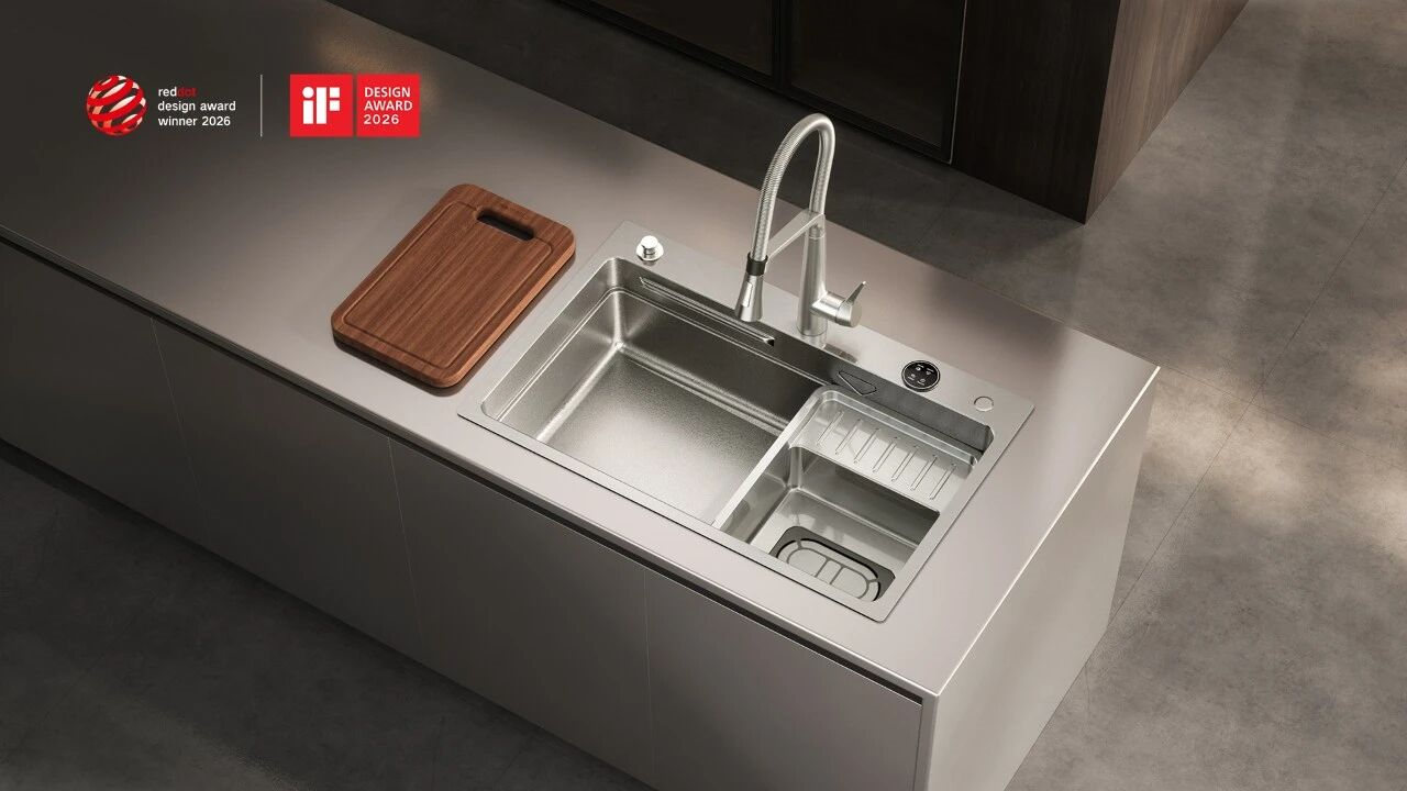 悍高 · CB2.0双核瞬鲜解冻轻智能水槽,近期荣获2026德国iF、红点双料设计大奖,该产品集解冻、清洗、抑菌于一体,首创双核驱动40 kHz高频共振微观冲击波实现冰晶粉碎,配合32°C恒温精密温控系统形成立体解冻场域。相比自然解冻,其食品解冻速度提升约8倍,且能全方位深度清洗,不破坏食材表面,轻松洗净龙虾、海鲜、果蔬污垢,启幕未来厨房新净界,以创新赋能实用,让生活更有温度。