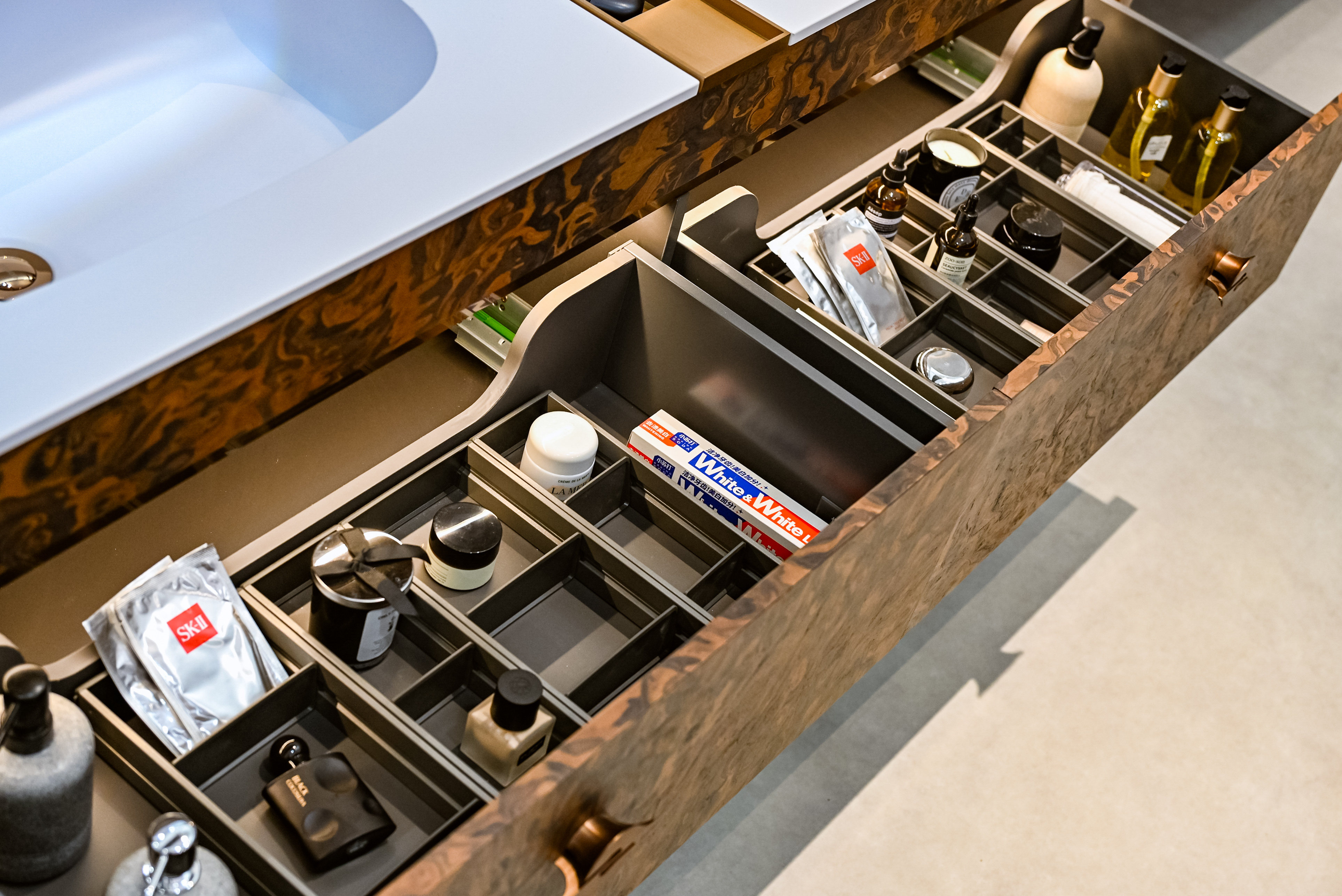 高定浴室柜以意式原创设计为核心,流畅曲弧线条勾勒出优雅轮廓,甄选优质环保实木板材,防潮防变形,搭配温润细腻的意大利ALPI进口木皮点缀,触感柔软亲肤,纹理自然有光泽,质感高级且富有层次。功能上,科学的分区收纳设计,可有序分类收纳各类物品,告别杂乱;同时搭配智能镜,自带柔光补光功能,光线柔和不刺眼;五金配件选用悍高专属优质五金,开关柜门顺滑无噪音,承重性强,经久耐用;转角圆弧设计更是在细微之处彰显品质与匠心,精准契合当代消费者对轻奢、舒适、便捷的卫浴生活需求。